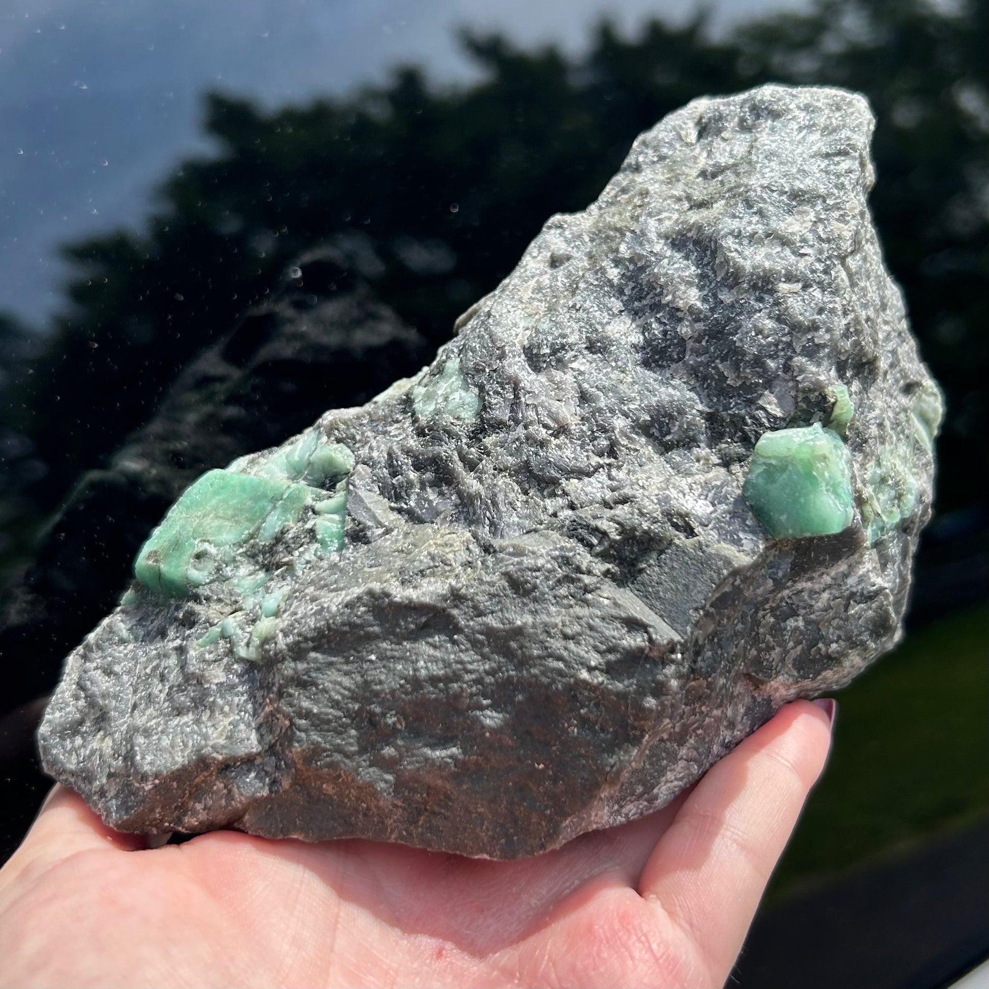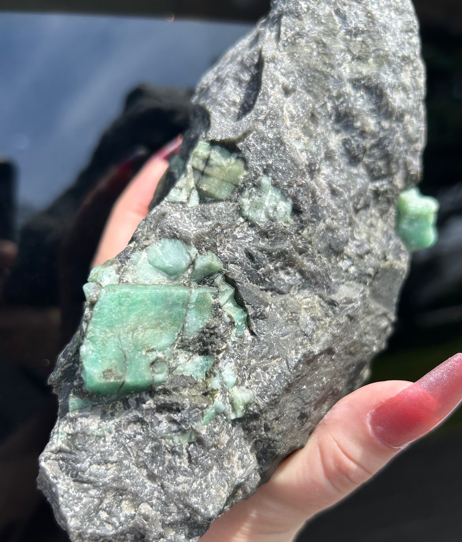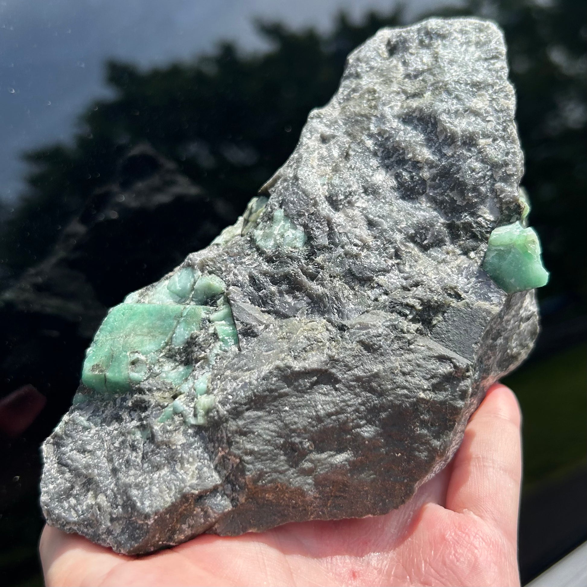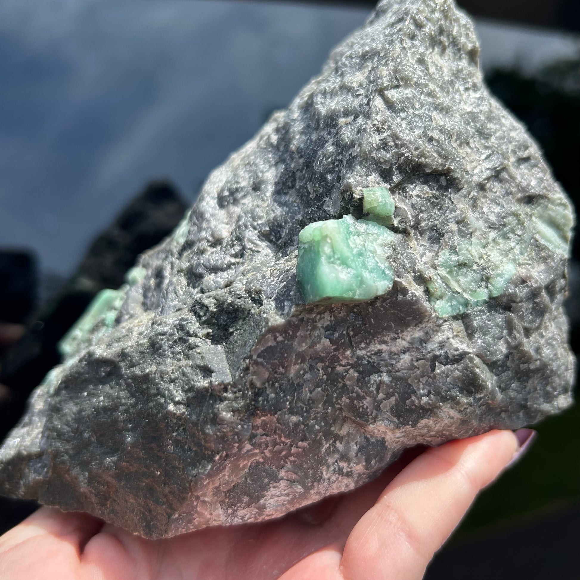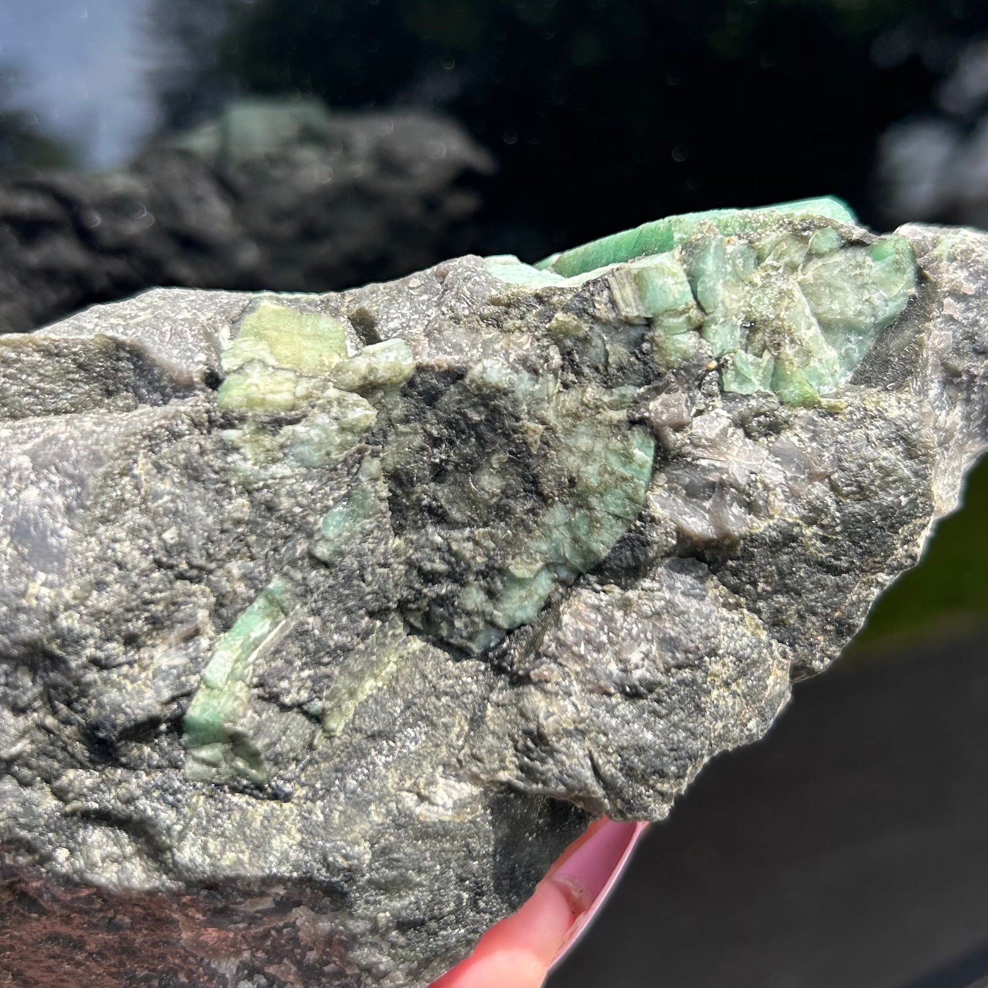 Experience the natural allure of Brazilian emerald on matrix with this exquisite specimen from Minas Gerais. This raw stone showcases vibrant emerald crystals nestled within their rocky matrix, highlighting the geological formation process.