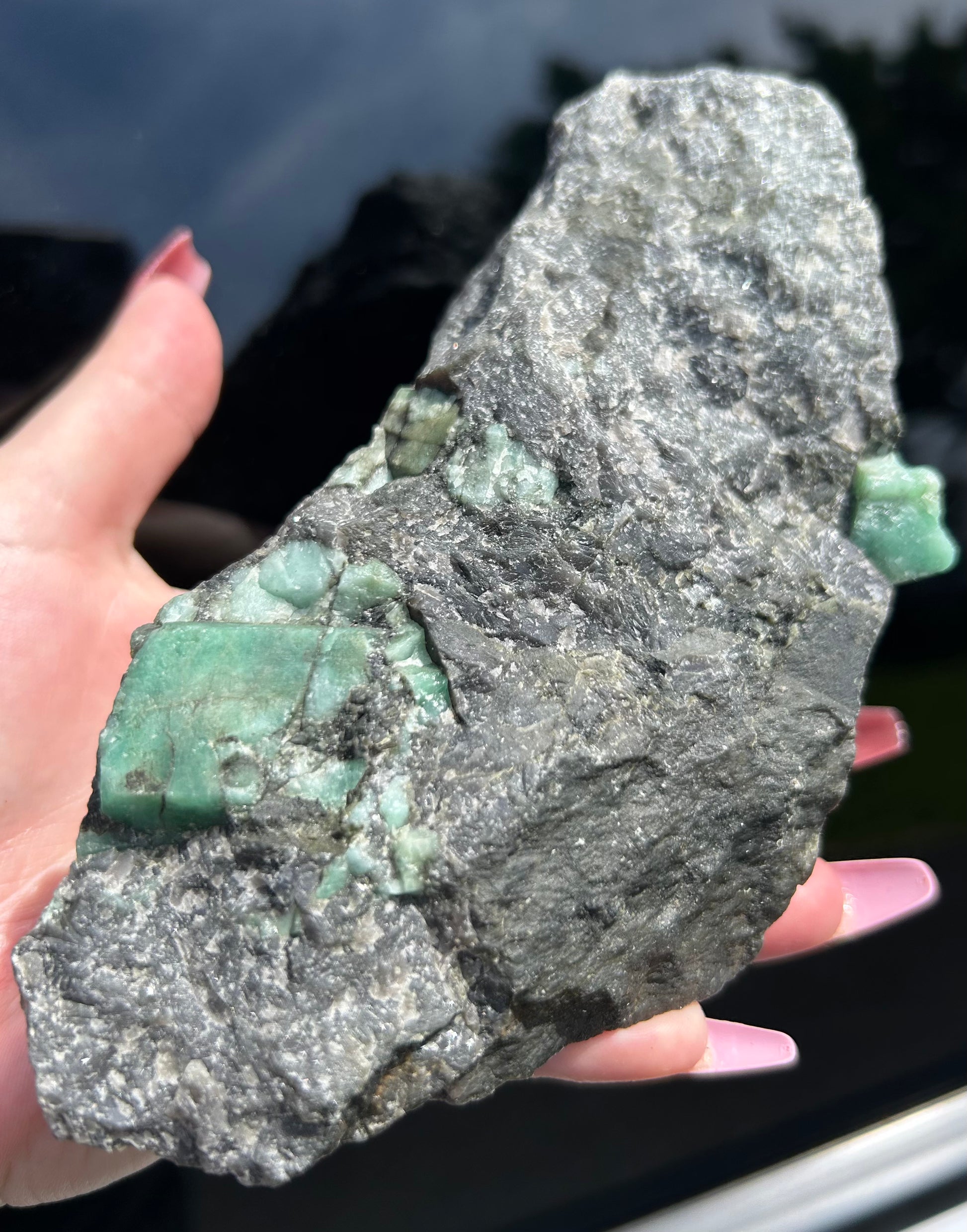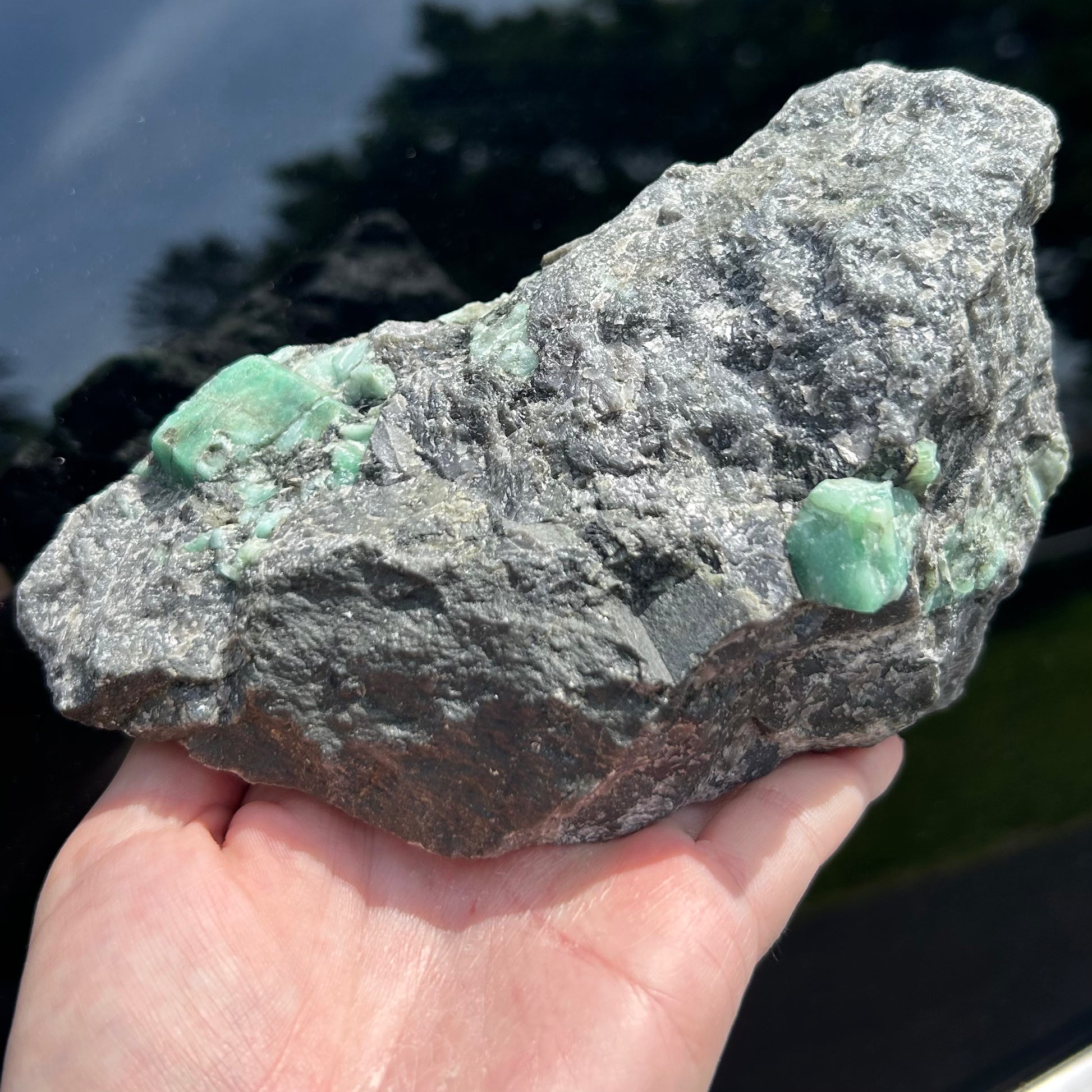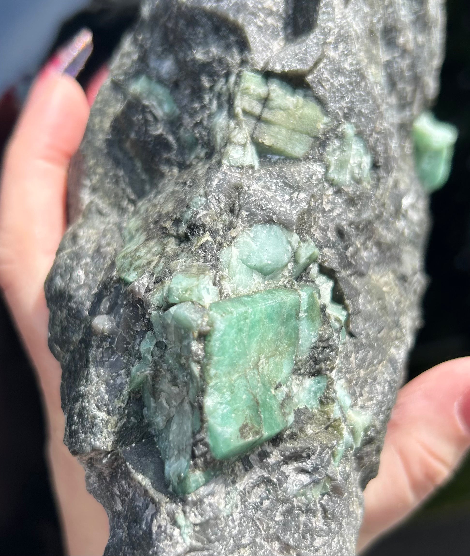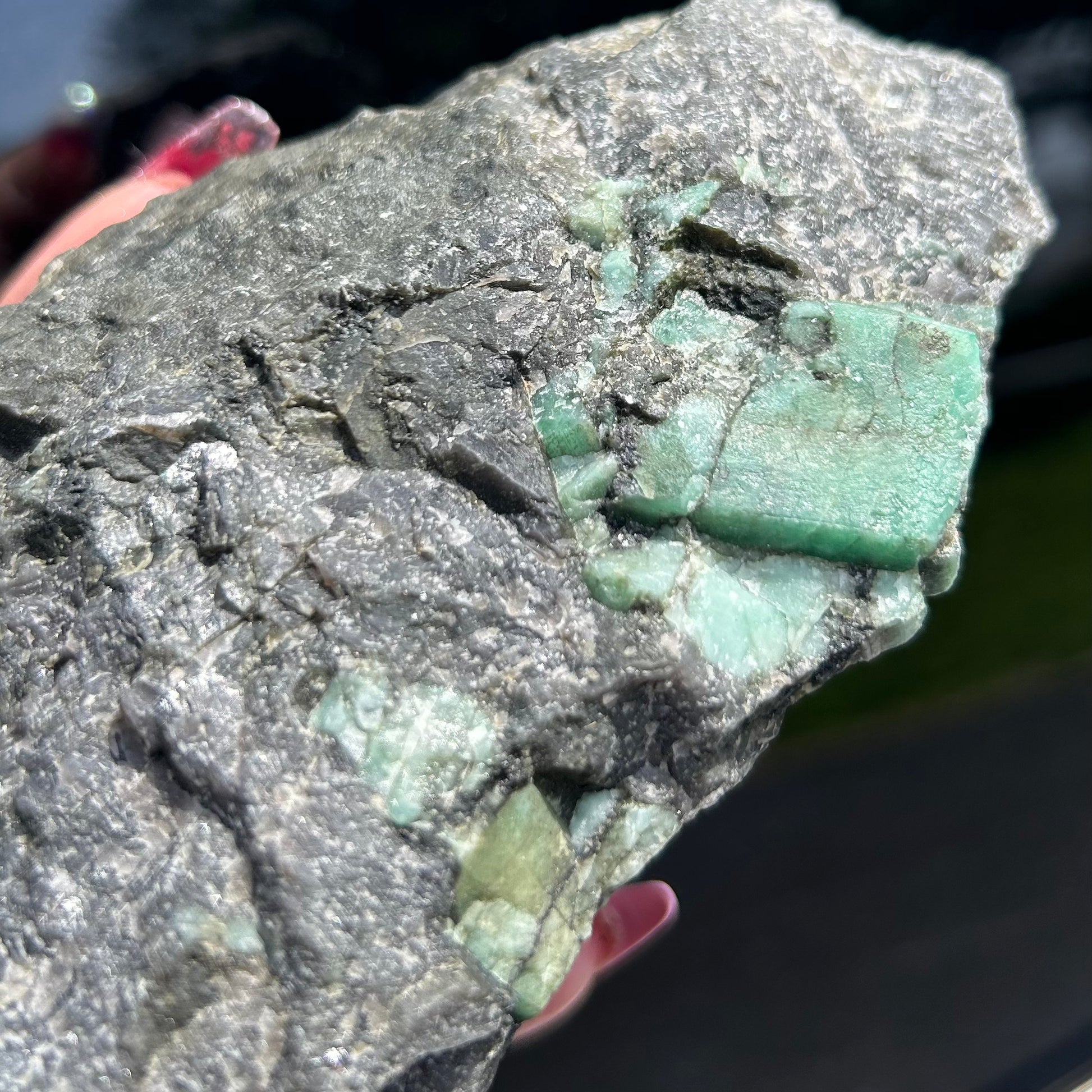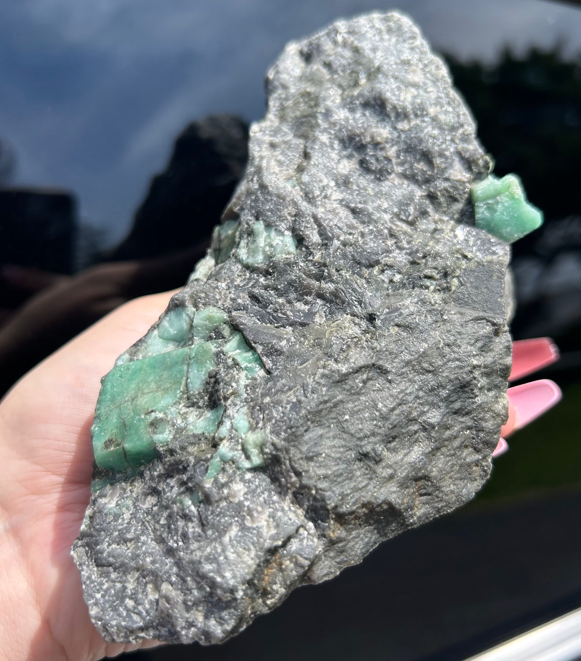 Experience the natural allure of Brazilian emerald on matrix with this exquisite specimen from Minas Gerais. This raw stone showcases vibrant emerald crystals nestled within their rocky matrix, highlighting the geological formation process.